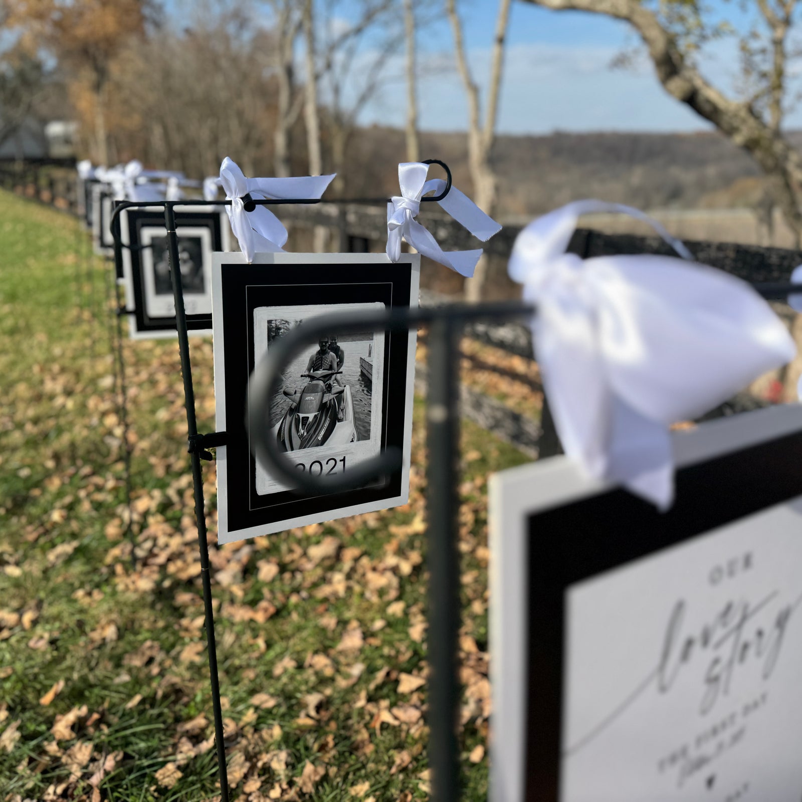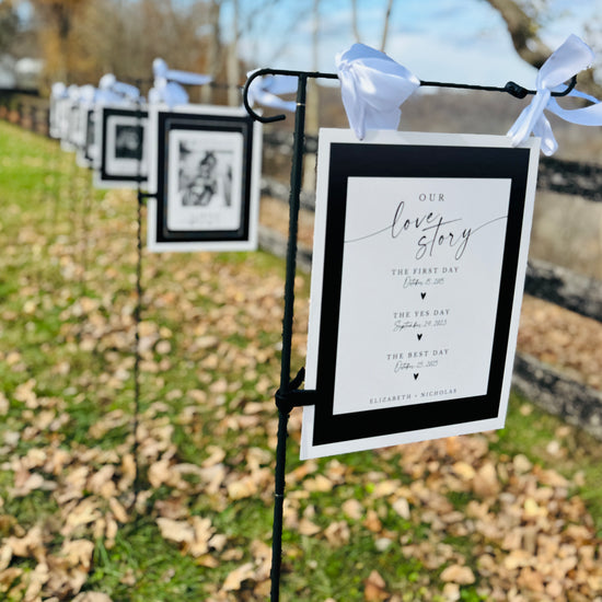 Request A Custom QuoteTurn your love story into a walk-through gallery your guests will remember. Custom prints on black metal stakes, styled to match your wedding aesthetic.