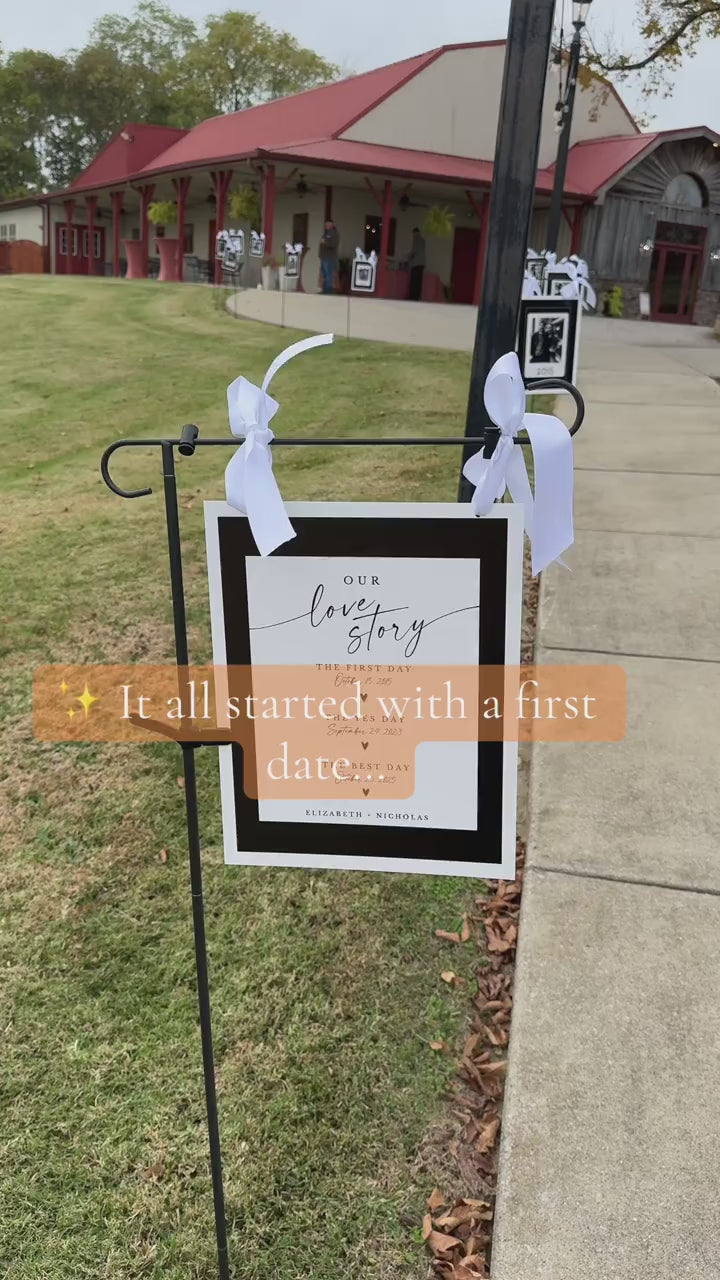 A beautifully curated photo timeline display for ceremonies, aisle entrances, or receptions.